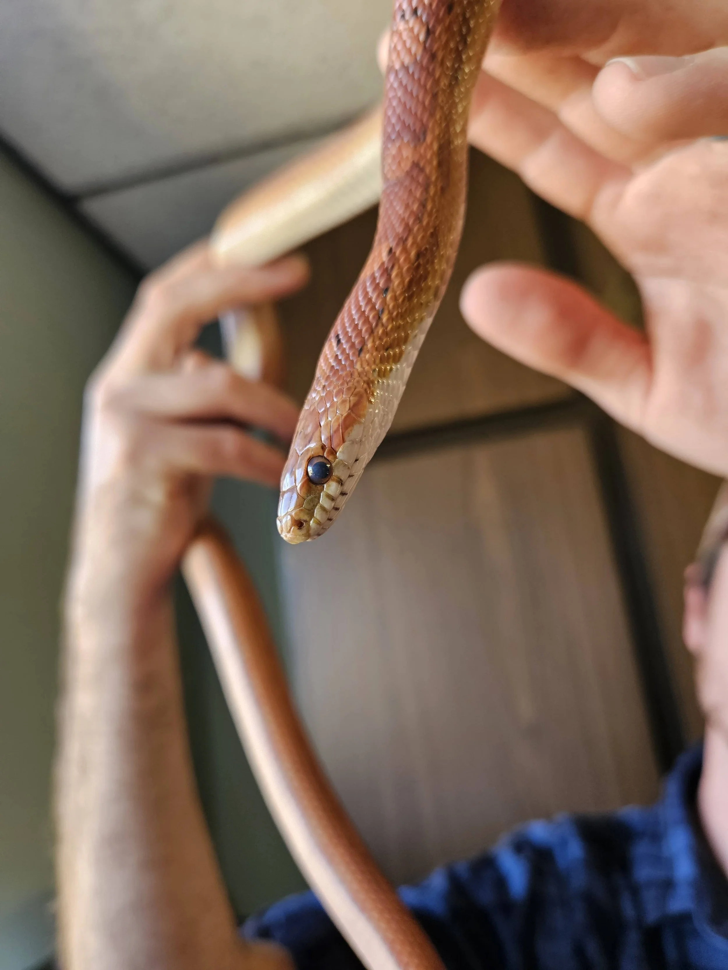 This gorgeous corn snake is Io. Io is named after one of the moons of Jupiter and would love to enter your orbit! Io is still growing at only around 2 feet long, however this friend could reach over 4 feet as an adult!